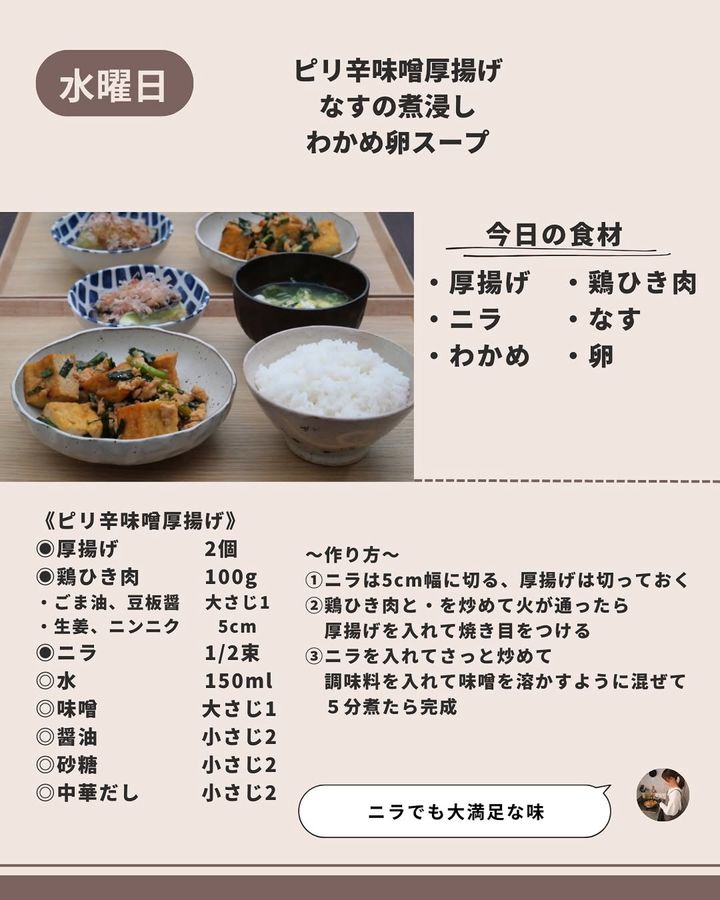 1週間ごはん3日目、水曜日の主菜はピリ辛味噌厚揚げ。