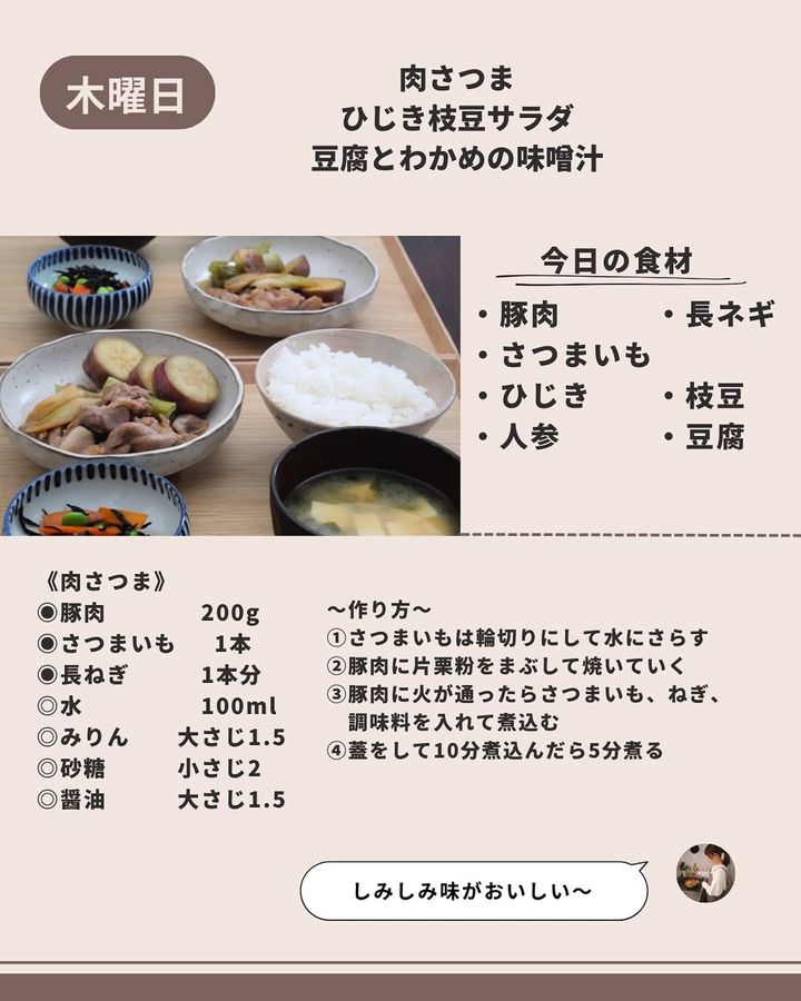 皮を剥かなくてもいいものは剥かない、副菜は基本レンジ調理か混ぜるだけにして調理工程の手間を省くなど、毎日おいしいご飯を作れるように続けられる自炊を意識しながら、1週間の献立を考えられている@copi__gohanさん。