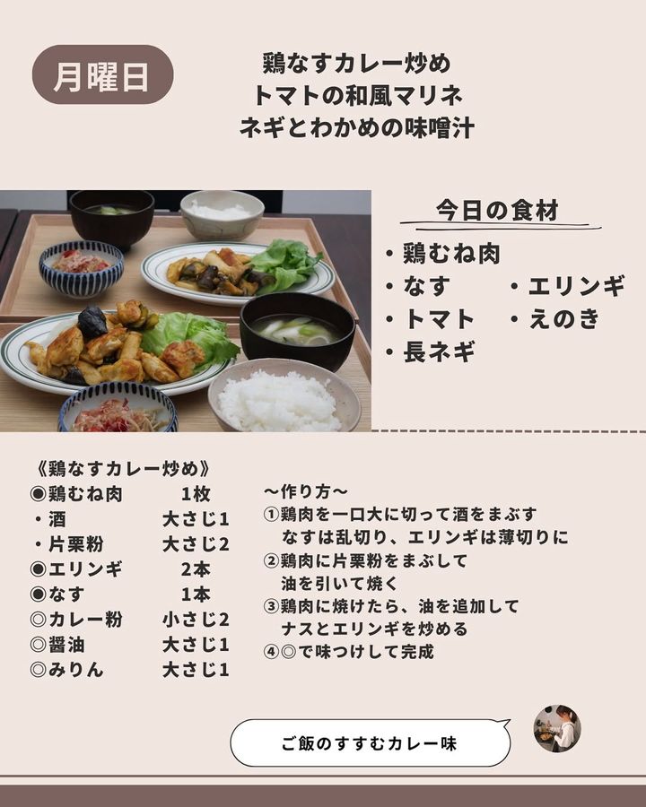 1週間ごはん1日目、月曜日の主菜は鶏肉となすのカレー炒め。