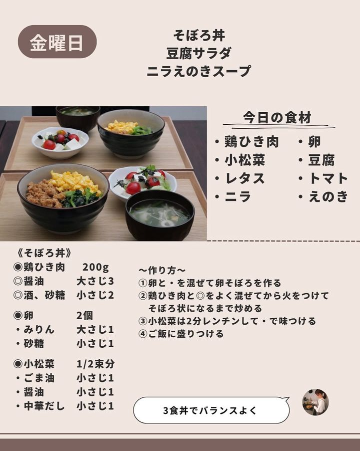 卵そぼろを作ってから鶏そぼろを作ることで1つのフライパンで完成する献立のように、金曜日は丼や麺類のラクなものに固定されているという@copi__gohanさん。無理なくおいしくバランスのよい平日最後の夜ご飯、1週間お疲れ様でした。