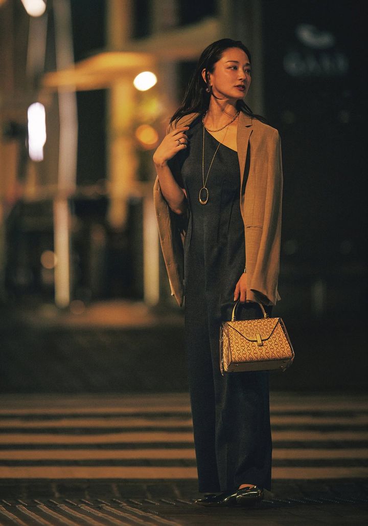 繁華街とは一線を画すムードに緊張×高揚感が 織り交じる大人の街。普段はしないジャケットの肩掛け×オールインワンで大人の色香を纏って。
