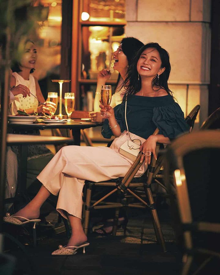 [中越さん]オフショルダーカットソー¥23,100(HER.)パンツ¥20,900(アルページュストーリー)バッグ¥203,500(ヴァレクストラ/ヴァレクストラ ジャパン)ミュール¥272,800(ジミー チュウ)ピアス¥33,000(ブランイリス/ブランイリス トーキョー)ブレスレット¥29,700(ローラ ロンバルディ/八木通商)リング[右手]¥20,900〈mysha〉 リング[左手人さし指]¥22,000〈vv〉(ともにロードス)リング[左手中指・薬指]¥20,900(バルブス/ズットホリック)[友人・左奥]ドット柄ビスチェ¥46,200(ダブルスタンダードクロージング/フィルム)ノースリーブカットソー¥9,350(アルページュストーリー)[友人・右奥]パフスリーブブラウス¥19,500(シーニュ)