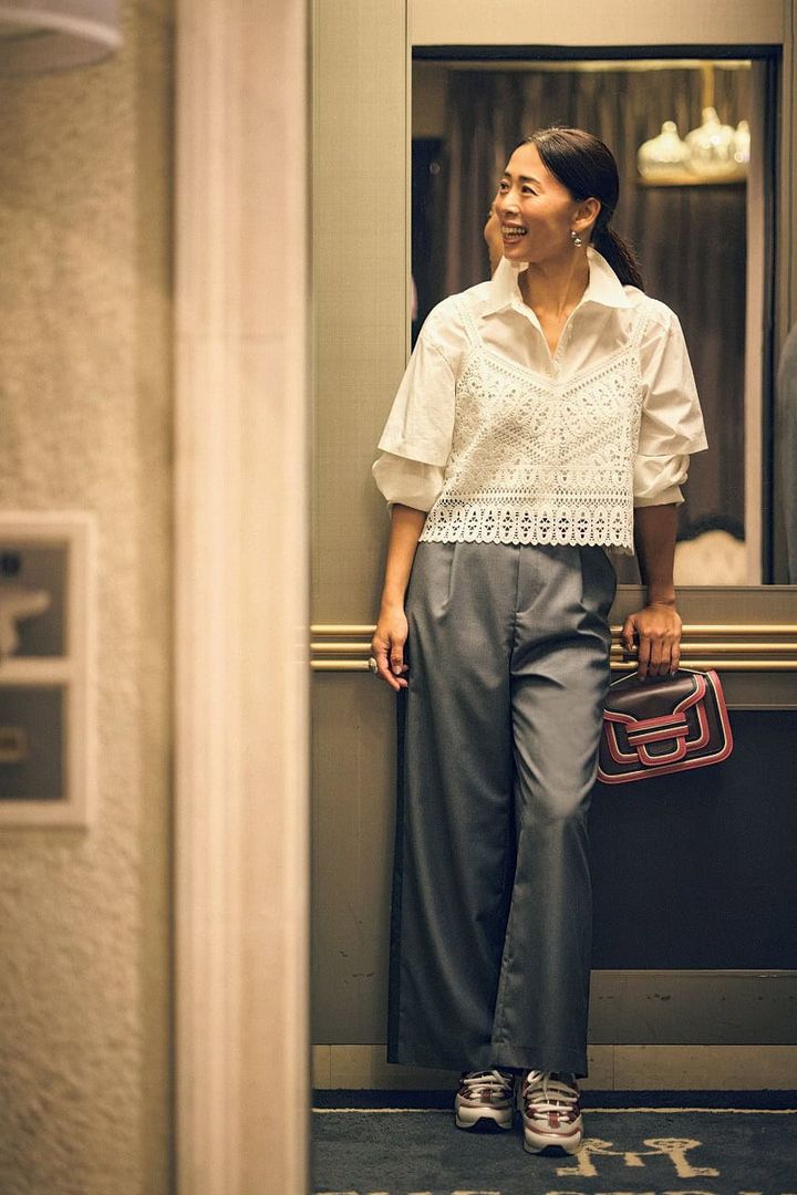 レースのキャミソールは、言わずもがなの今っぽさと、レイヤードによる秋らしさを簡単にプラスできるおすすめアイテム。七分袖の程よい丈感は、28℃前後の気温に最適で、冷房対策にも◎。シンプルなシャツスタイルが一気に旬顔になり、昼も夜も品よく映えるスタイルに。