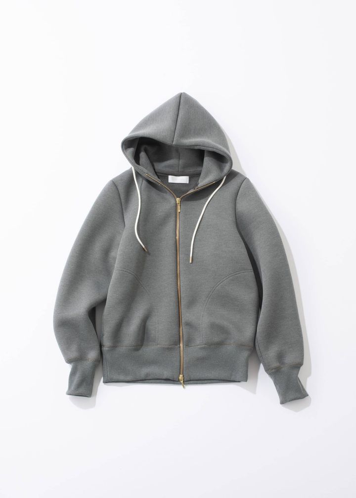 軽やかなスポンジダンボール素材で仕立てた、エアリーなダークグレーのパーカー。程よいハリと立体感でシルエットを美しく引き立て、リラックス感がありながらもきちんと見えが叶う一着。ワンマイルからオフィスの羽織りまで、洗練カジュアルの新定番です。