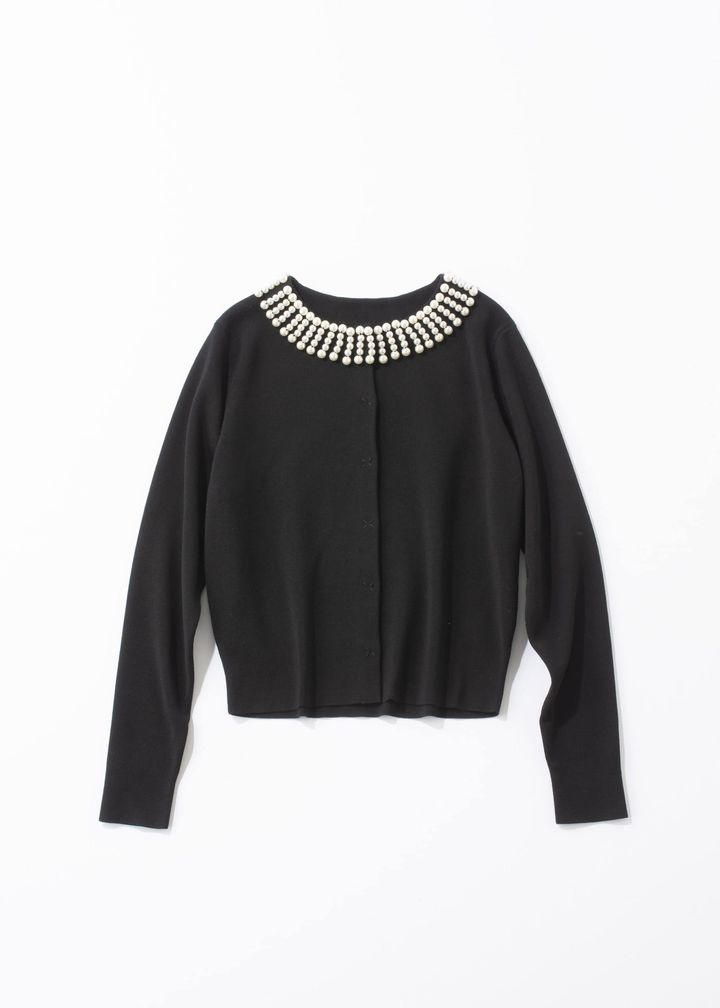 襟もとをぐるりと彩るパールが、ネックレス要らずで顔まわりを優しく照らす一枚。ノーブルなブラックが洗練された印象を引き立て、オンにもオフにも自在に着回せます。ノースリーブや半袖ワンピースに重ねても◎、季節の変わり目に頼れる存在です。