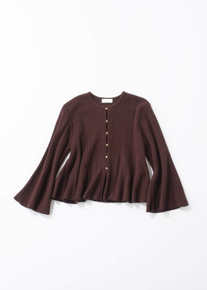 袖口と裾のフレアラインが揺れ、女性らしい動きを演出。コンパクトな着丈との絶妙なバランスで、フェミニンながらすっきりとしたシルエットに仕上がります。軽やかな着心地で秋のはじめにぴったり。温かみのあるブラウンが、装いに柔らかな表情を添えてくれる一枚です。