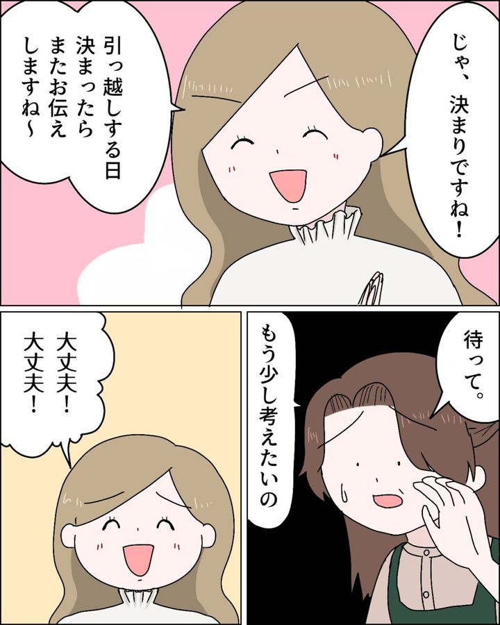 「じゃ、決まりですね!引越しする日、決まったらお伝えしますね」とどんどん話を進めます。「待って。もう少し考えたいの」と言っても「大丈夫大丈夫!」と聞いてくれません。