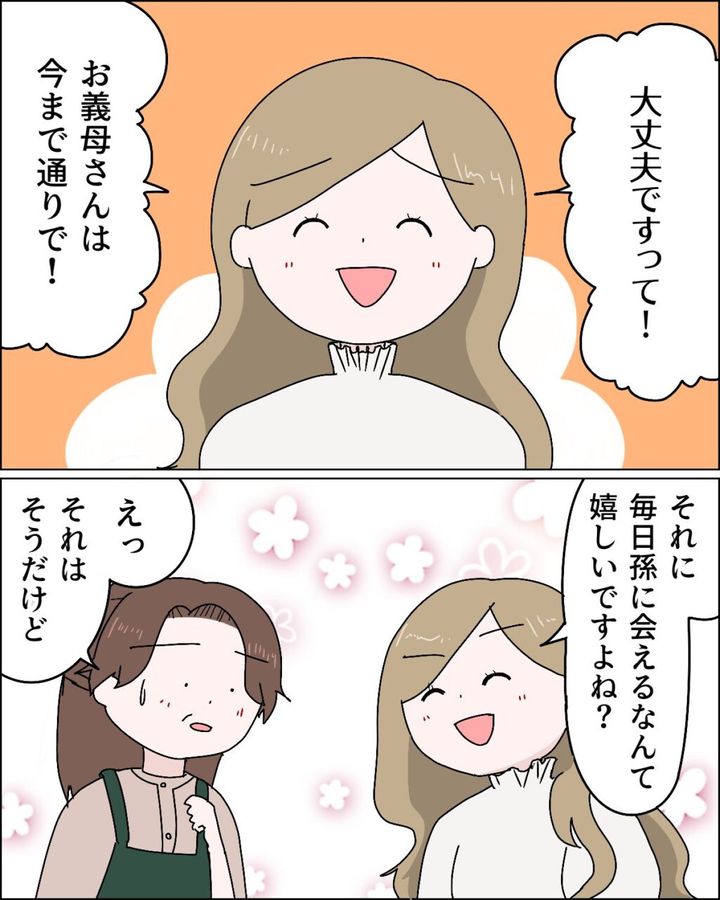 アミちゃんは「大丈夫ですって!お義母さんは今まで通りで!」と笑顔。「それに毎日孫に会えるなんて嬉しいですよね?」と言われて「えっそれはそうだけど」と答えると