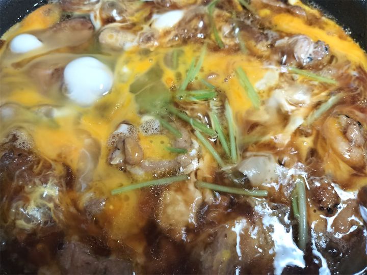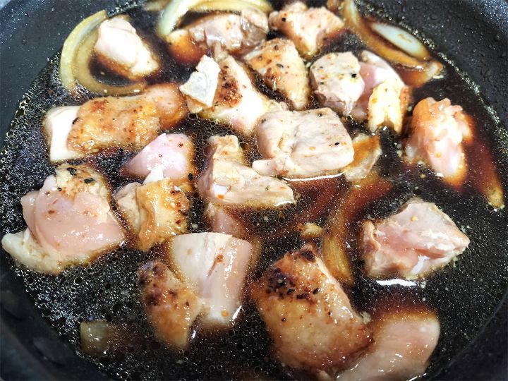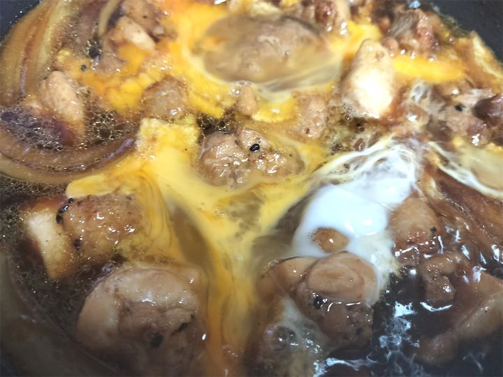 鶏肉は皮目を最初にしっかり焼く、というのがお約束なんだなと最近は納得していますが、親子丼なのにまさか一枚肉のまま焼くとは思いませんでした。ですが、確かにこの方が皮目をきれいに焼けますし、一口大の肉を何度も転がさなくて済むのは合理的です。