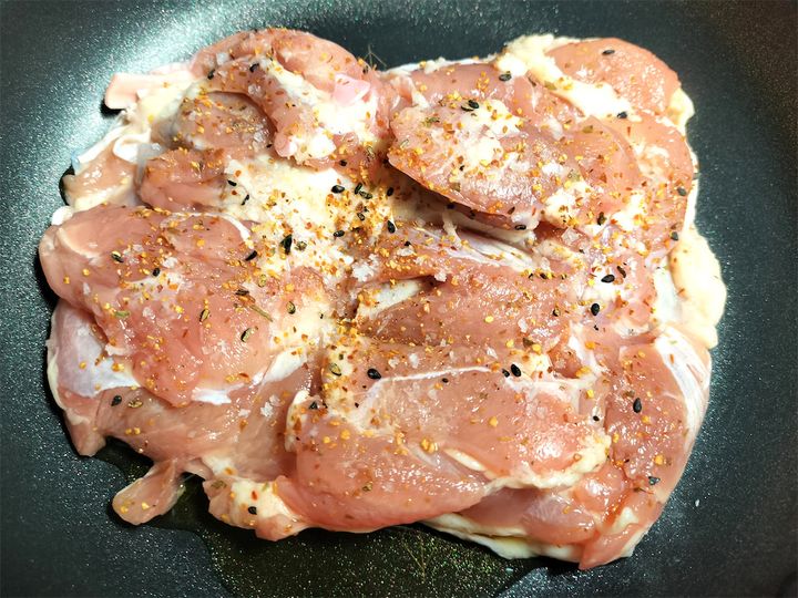 1. 鶏肉の両面に塩、身には七味も振って10分おきます。