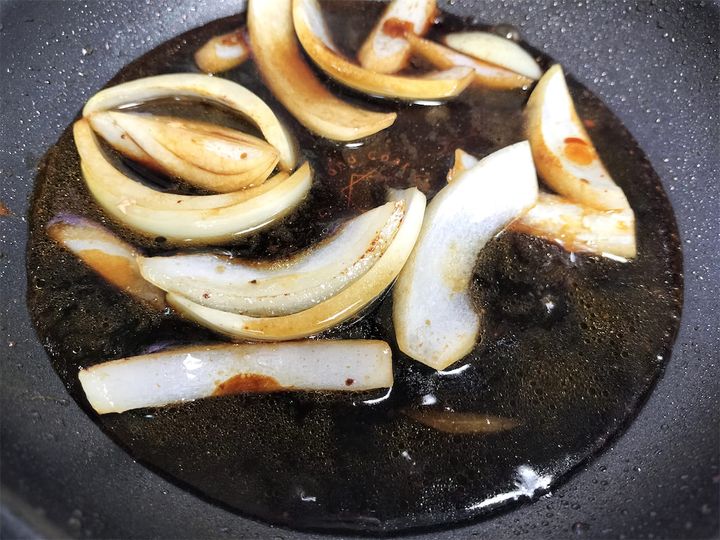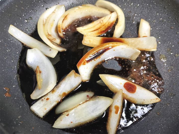 3. 玉ねぎに色がついてきたら、しょうゆを入れて中火にします。