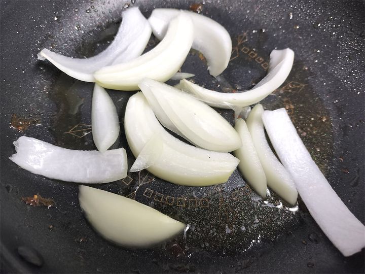 2. 脂が残ったフライパンに玉ねぎを入れて弱火にかけます。
