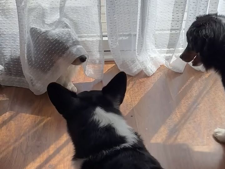3. カーテンの裏から「ばぁ!」コーギー兄弟のドッキリごっこが面白すぎる