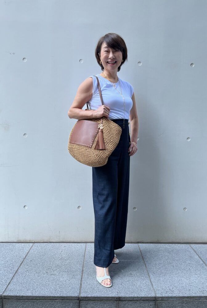 「『ラルフローレン』のバッグは、夏の素材で毎日持ちやすいデザイン。日傘やボトル、タオルなど、かさばる荷物もサブバッグなしで収まります。かごバッグは素材が肌に当たると痛いものもありますが、これはそんなこともなく使いやすいアイテム。外ポケットがレザーなのでカジュアルになりすぎず、きれいめの着こなしにもぴったりで重宝しています」