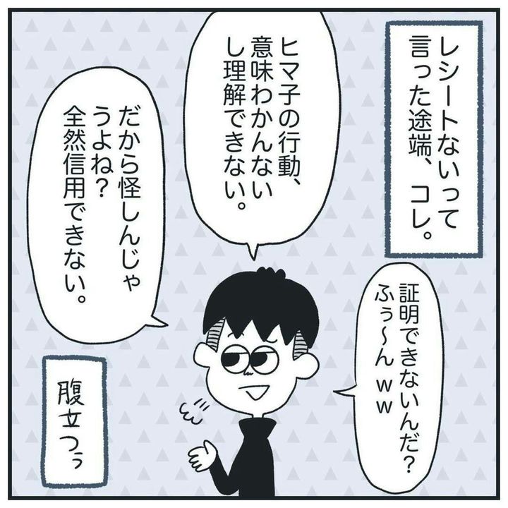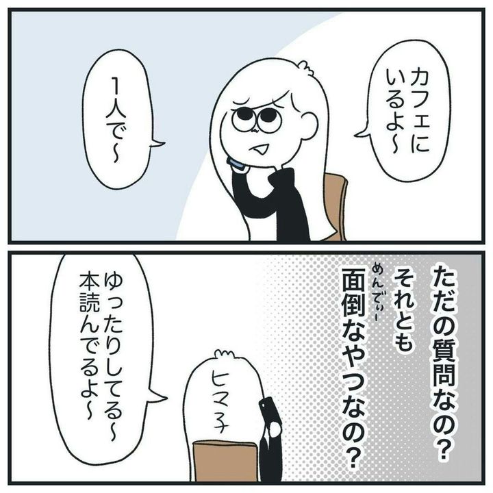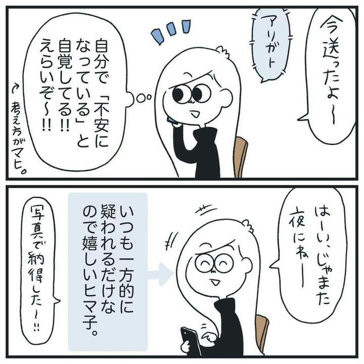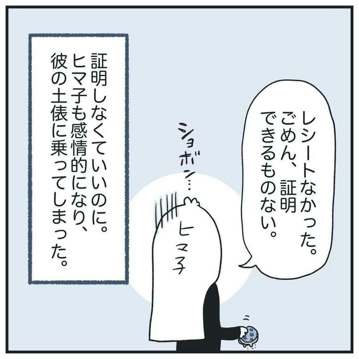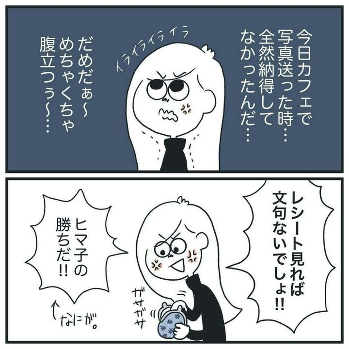 そして夜。彼氏と会い、食事をしているとき、再び「本当にカフェに1人だった?」と、蒸し返されてしまいます。実は以前、家で夕方まで寝てただけなのに、浮気を疑われたことがあります。そのときは、何も証明することができず、ヒマ子さんが謝り、一件落着。果たして、今回は…。