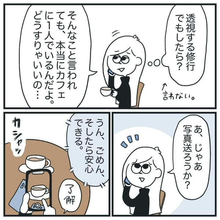 1人でカフェにいることすら疑われるなんて…。今回は、写真を送ったので、納得したようです。