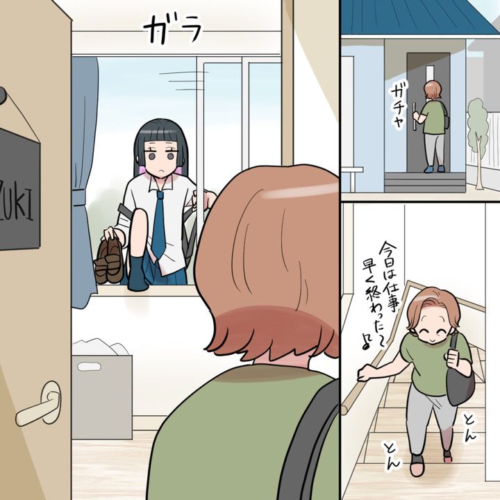 ある日の夕方。今日は仕事が早く終って帰宅できたのでなんだか気分がいい。少し休んでから夕飯の準備をしようかな、なんて考えながら2階へ上がっていた私は、息子ミズキの部屋を通り過ぎた時にあり得ない光景を目にしたのです。知らない女子高生が窓から今まさに侵入しようとしているのです。
