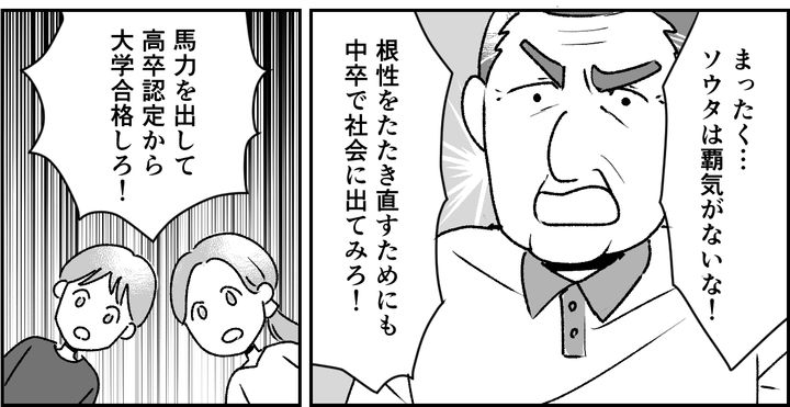 義父は「まったく……ソウタは覇気がないな! 根性をたたき直すためにも中卒で社会に出てみろ!」と、息子に言いました。