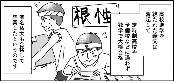 高校進学を絶たれた義父は奮起して、定時制高校や予備校などに通わず独学で大検合格、有名私大も合格して卒業したというのです。