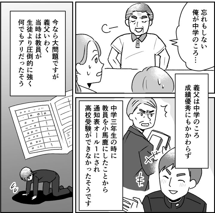 義父は中学のころ成績優秀だったそうですが、中学三年生のときに教員を小馬鹿にしたことから通知表オール1にされ高校受験ができなかったそうです。今なら大問題ですが、義父いわく、当時は教員が生徒より圧倒的に強く何でもアリだったそう……。