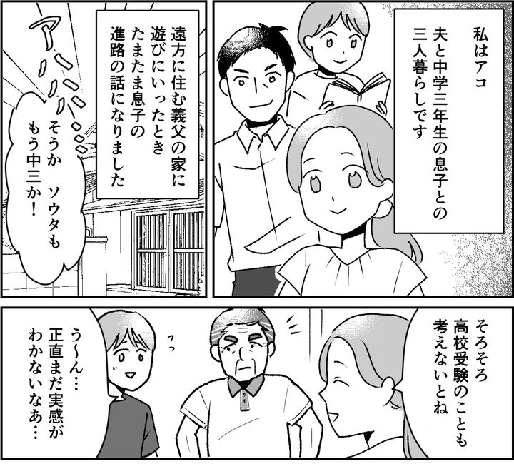 私はアコ。夫と中学三年生の息子(ソウタ)との三人暮らしです。遠方に住む義父の家に遊びにいったとき、息子の進路の話になりました。