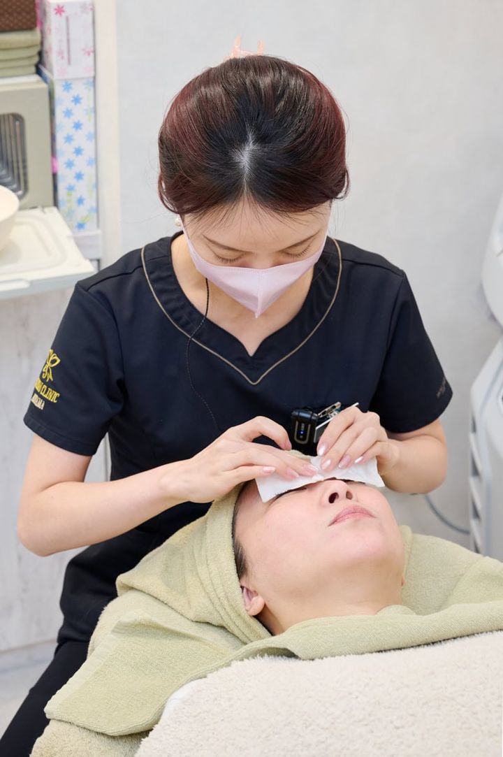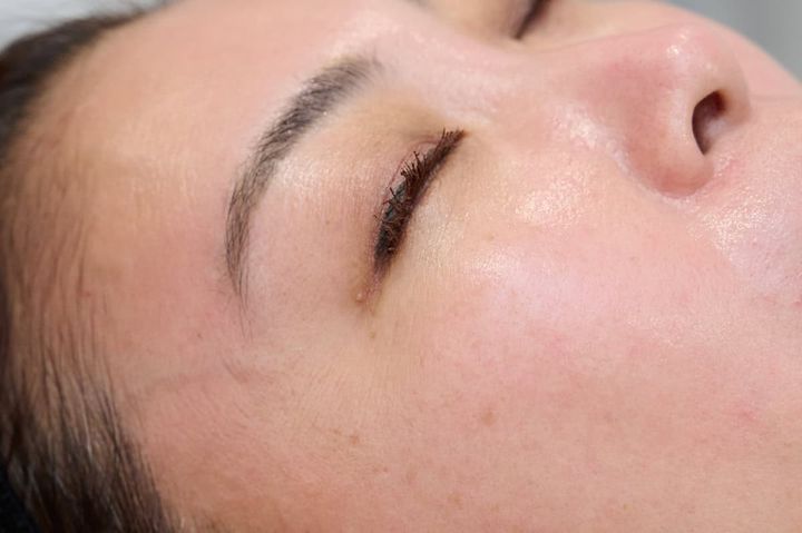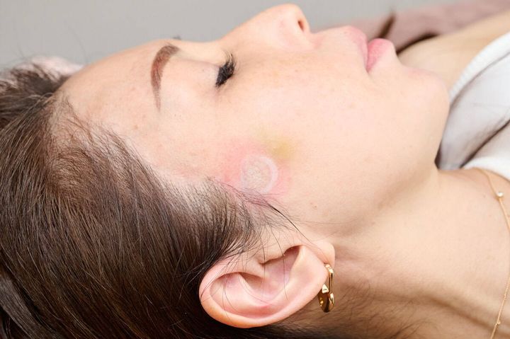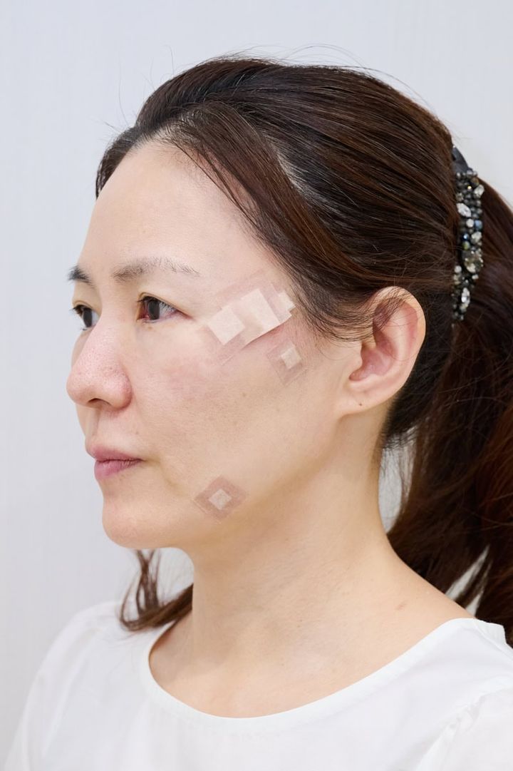 剥がせるシミ治療として話題のリポットレーザーは、大きく目立ったシミにアプローチできます。肝斑治療に効果はないものの、悪化は防ぐことができるため、今回のように肝斑とシミが混在している部分にも照射が可能。一瞬チリチリと弾くような痛みがあるくらいで、あっという間に施術が完了しました。