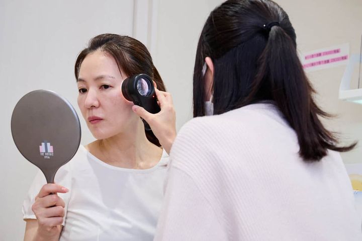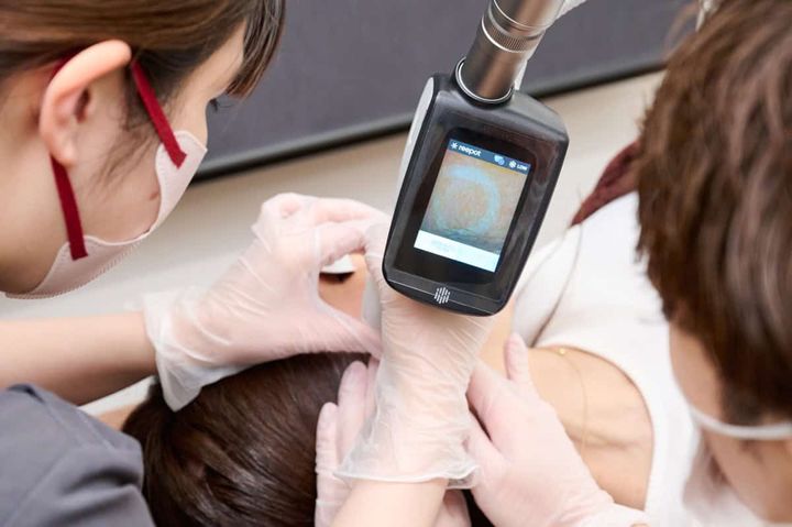 こちらのクリニックでは、専門医がダーモスコピー(拡大鏡)を使って、シミらしきものを一つずつ診察。