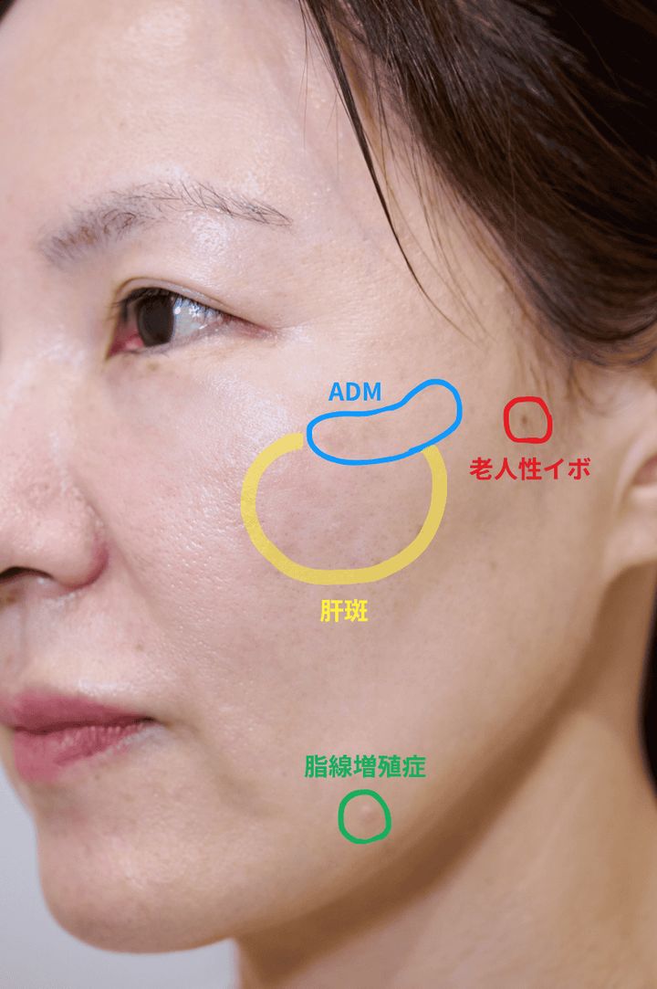 結果、頬に広がったもやもやとしたものは、肝斑。また肝斑にADMが重なっていることがわかりました。加えて、耳の横は老人性イボ(脂漏性角化症)、口の横は脱脂増殖症であることが判明。