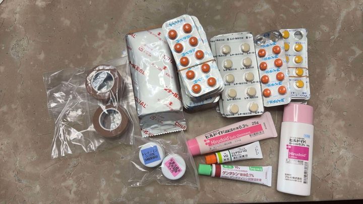 ビタミンE・C・B、張り替え用の保護テープ、肝斑に塗るトレチノインとハイドロキノン、化膿止めの軟膏と保湿剤。