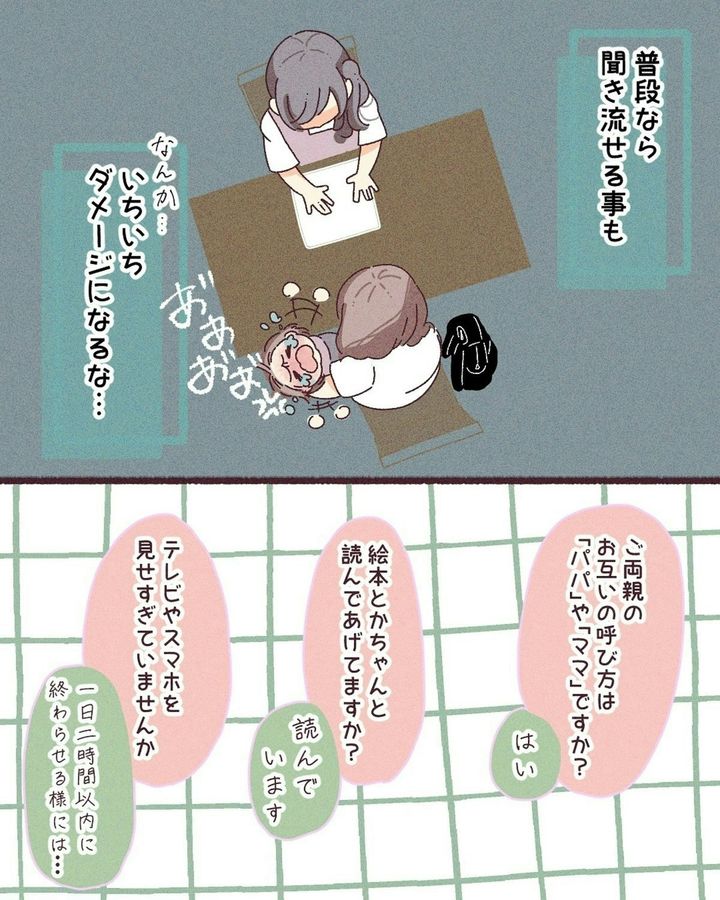歯科検診、身体測定、医師の問診など、さまざまな健診を受け、親子ともに疲労困ぱいな状態。娘も不機嫌MAXで、泣き止みません。そんなとき、保健師にため息をつかれたら…。誰だって、傷つきます。