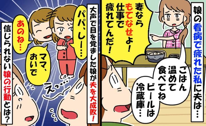 仕事帰りの夫「疲れた俺をもてなせ!」私も娘の看病で疲れてるのに…。2歳の娘が痛快な方法で大成敗♪