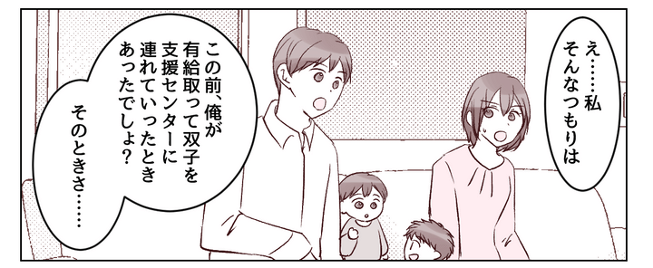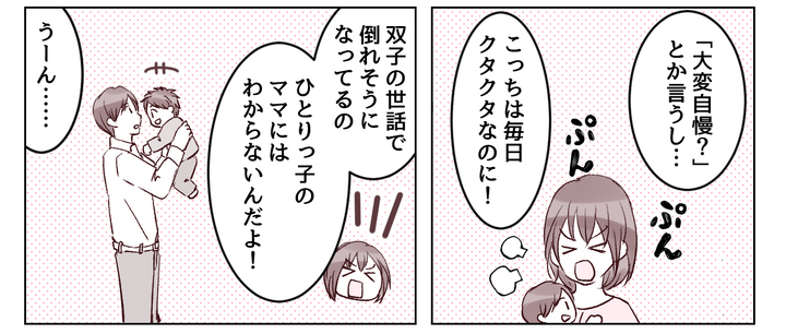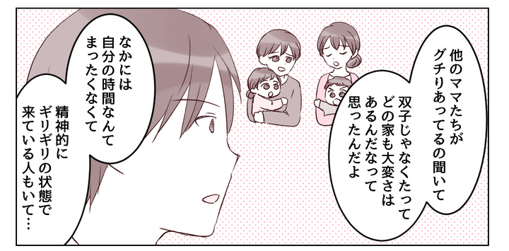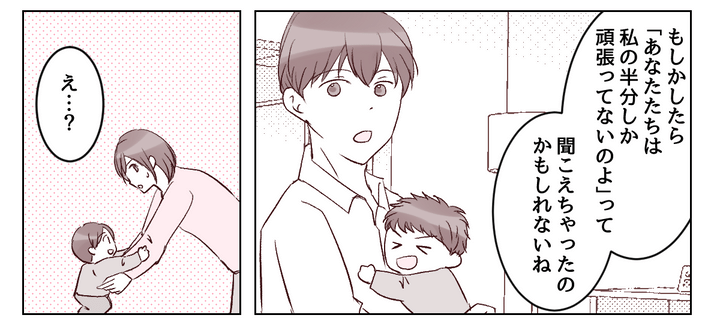 私が今日あった出来事を話すと、夫は少し考えた後に思いがけない言葉を返してきました。もしかしたら「あなたたちは双子ママの半分しか頑張ってない」という意味に取られてしまったのでしょうか。そんなつもりはなかったけれど……。