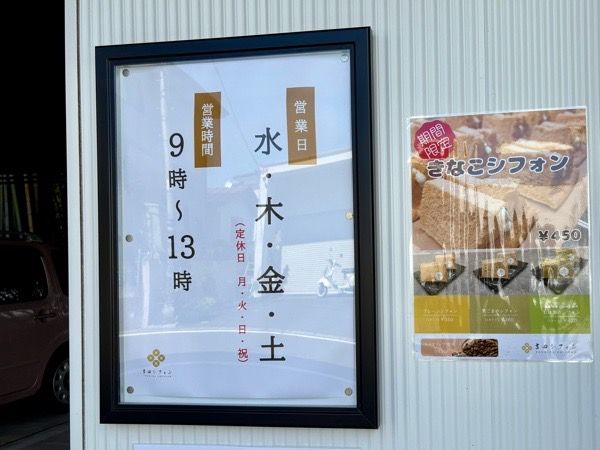 営業は水・木・金・土曜の9~13時と限られているので、ご注意を。 人気のシフォンケーキは売り切れ必至、予約がおすすめですよ。 ふわっふわのシフォンケーキをぜひ堪能してみてくださいね。