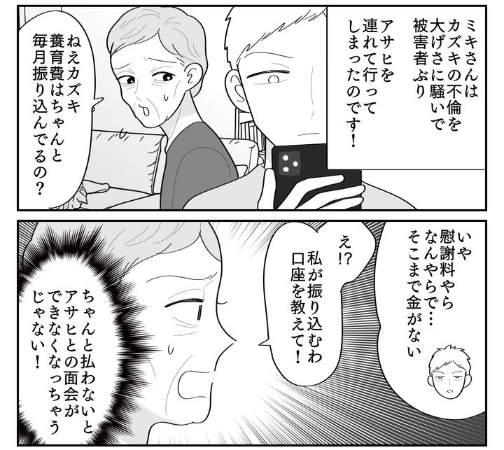 私はマサミ。ひとり息子のカズキは3年前に離婚し、可愛い孫のアサヒは元嫁のミキさんのもとにいます。アサヒは幼い頃から優しくておばあちゃん思いの子。早くに夫を亡くした私は、いつか同居して忙しい息子夫婦の代わりに孫を育てるものと思っていました。しかし息子夫婦が離婚した今、私はアサヒに会えるのは2ヶ月に1回だけ。私がこんなに寂しい思いをしているのは、すべて嫁として至らなかったミキさんのせいなのです。