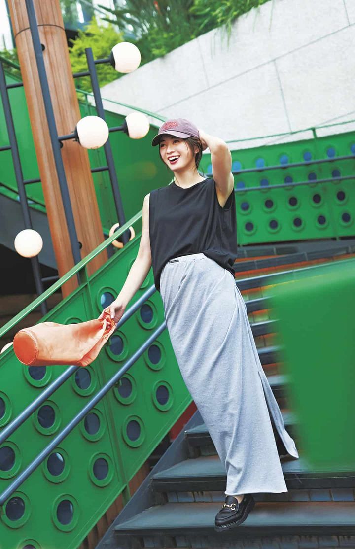 ノースリトップス¥3,990(アンフィーロ/オンワード樫山お客様相談室)スカート¥18,700(プランクプロジェクト/プランクプロジェクト 青山店)バッグ¥16,500(ハウスオブ ロータス)シューズ¥96,800(パラブーツ/パラブーツ青山店)キャップ¥8,250(ザ シンゾーン/シンゾーンルミネ有楽町店)ピアス¥113,300※片耳価格(プライマル)