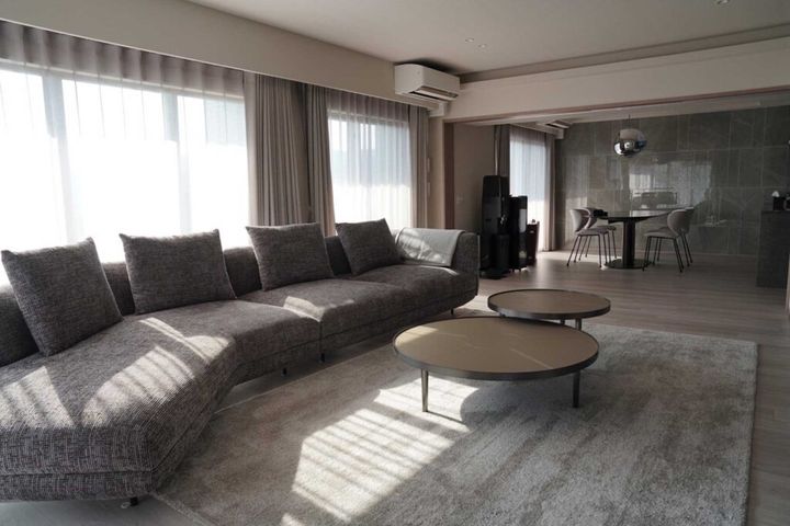 「安心感と緊張感の合間をテーマに、とことんヴィジュアルを2人好みに追求。木製床やコンクリートの梁あらわし、白ソファなどをMIX」