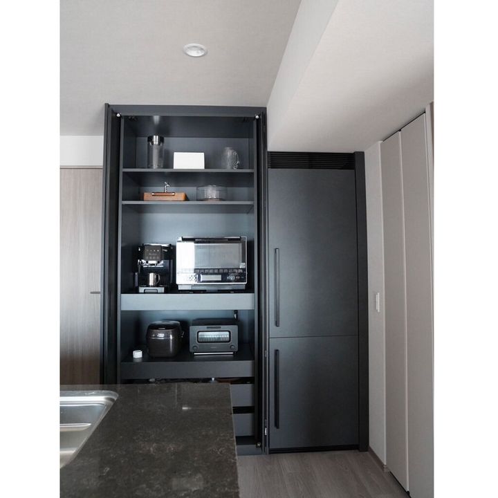 「友人たちがいつでも遊びに来やすいように、白・黒・グレーで統一したインテリアを選んで、すっきりとしたホテルライクな空間に。キッチンは収納棚を開閉式にして、家電類は中に収めて生活感が出ないように工夫しました」