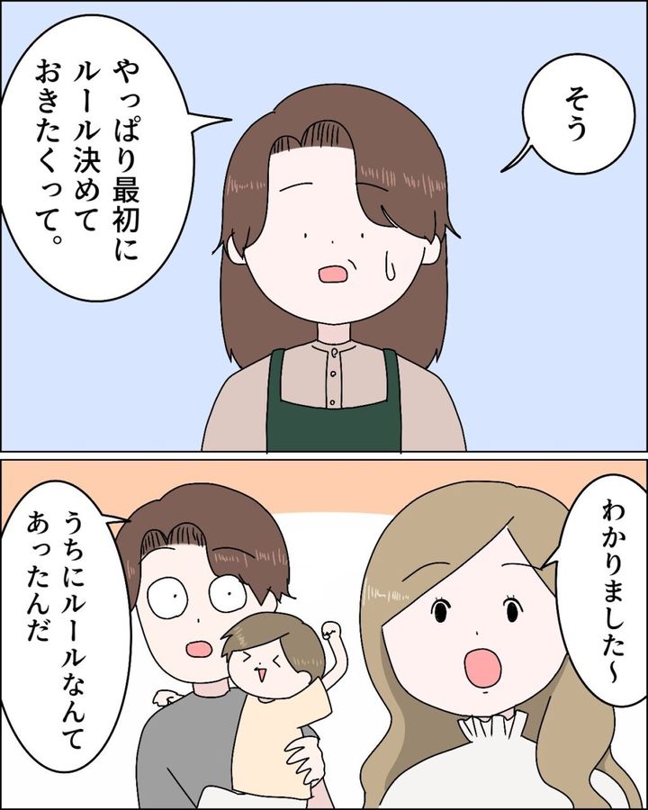 「やっぱり最初にルール決めておきたくって。」同居にまつわる嫁姑の話はたくさん聞いたことがあります。それを少しでも回避するため、昨日まで考えていました。「うちにルールなんてあったんだ」と目を丸くするショウ。そりゃそうよね、ここはショウの実家だけれど、もう結婚して別の家族ができているとなると話は別。ルールは必須だと思うのです。アミちゃんは「分かりました~」と言うので安心しました。