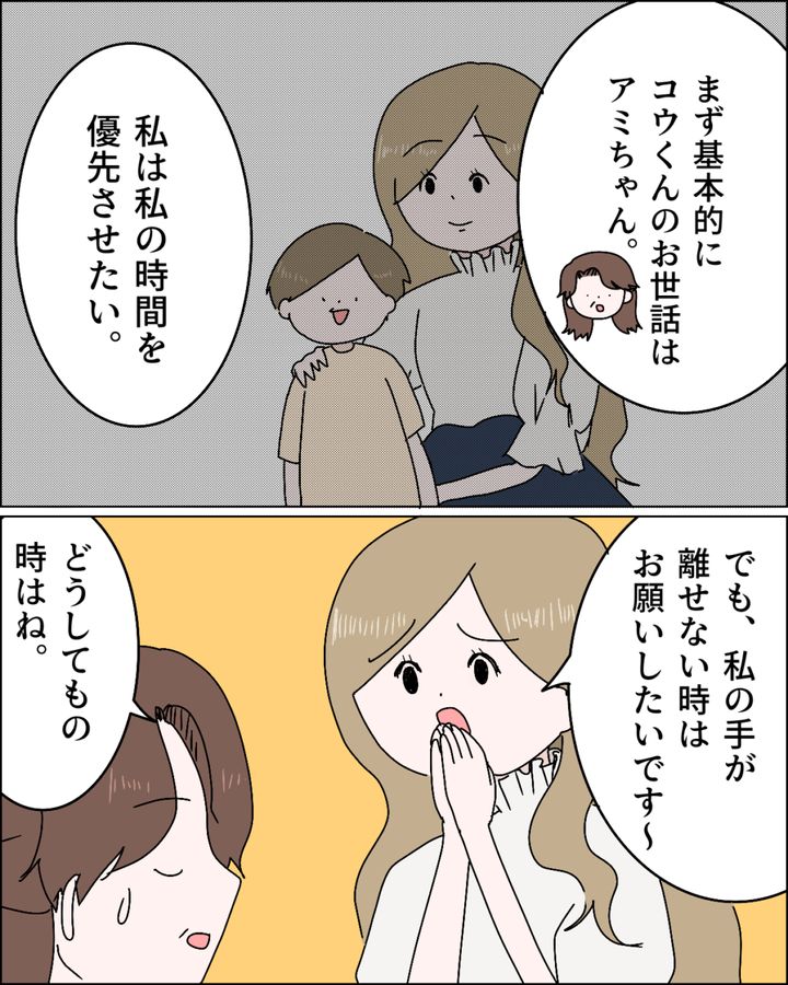 「まず基本的にコウくんのお世話はアミちゃん。私は私の時間を優先させたい。」そう伝えると、「でも、私の手が離せない時はお願いしたいです~」とアミちゃんが言うので「どうしてもの時はね。」と答えました。手が離せないって、もう今から言うアミちゃんに一抹の不安を覚えながら。