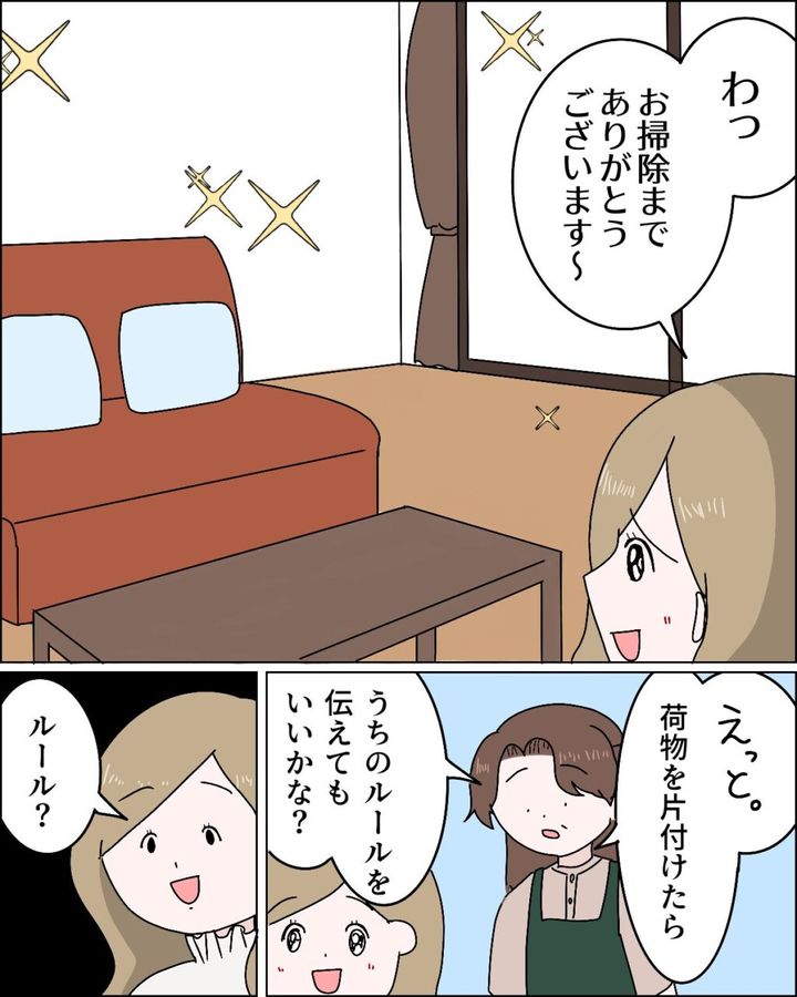 お試しとはいえ、半年間も同居生活するのですから、ショウさん家族が引越してきたタイミングでヨシコさんは家のルールを伝えました。最初が肝心。お互いに気持ちよく、トラブルなく過ごすためには必要ですよね。ルールを発表するたびになんだか不満そうなアミさんに、ヨシコさんはこれからの生活を一緒にいやっていけるのか、様子見ですね。