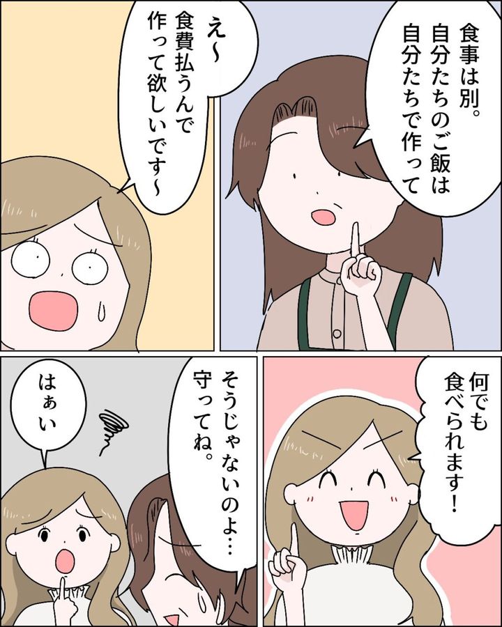 それから「食事は別。自分たちのご飯は自分たちで作って。」と伝えと、アミちゃんが慌てて「え~食費払うんで作って欲しいです~。何でも食べられます!」と言いました。この子ったら、お金を払えばやってもらえるって発想が先ず違うのよと思いつつ「そうじゃないのよ・・・守ってね。」とだけ答えるうと、渋々「はぁい」と・・・ちゃんとやってくれるかしら。