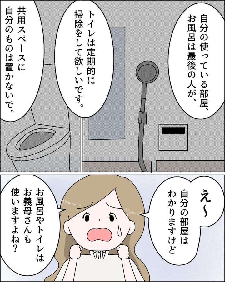 それから、「自分の使っている部屋、お風呂は最後の人が、トイレは定期的に掃除をして欲しいです。共有スペースに自分のものは置かないで。」と伝えると、またアミちゃんが「え~、自分の部屋はわかりますけど、お風呂やトイレはお義母さんも使いますよね?」と不満そうに言ってきました。この子、どういう立場で同居するつもりなのかしら。