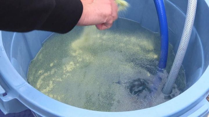 試しに、HBCの岡田ディレクターが抹茶ラテの粉末を混ぜた水を、この浄水器でろ過してみました。