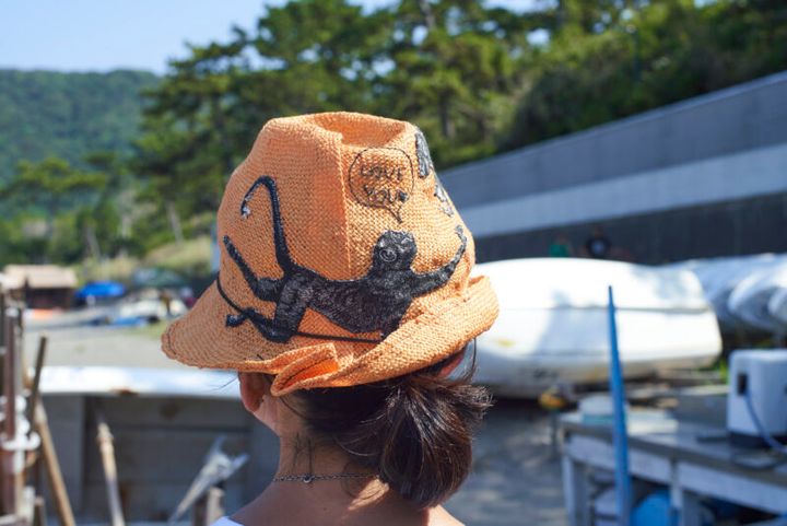 ベージュのサロペットパンツに合わせて、オレンジの麦わら帽子をかぶります。「黒いお猿さんが『LOVE YOU』と愛をささやくアップリケにひとめ惚れ。シンプルな組み合わせの服に個性を加えたいときに合わせます」(山根さん)