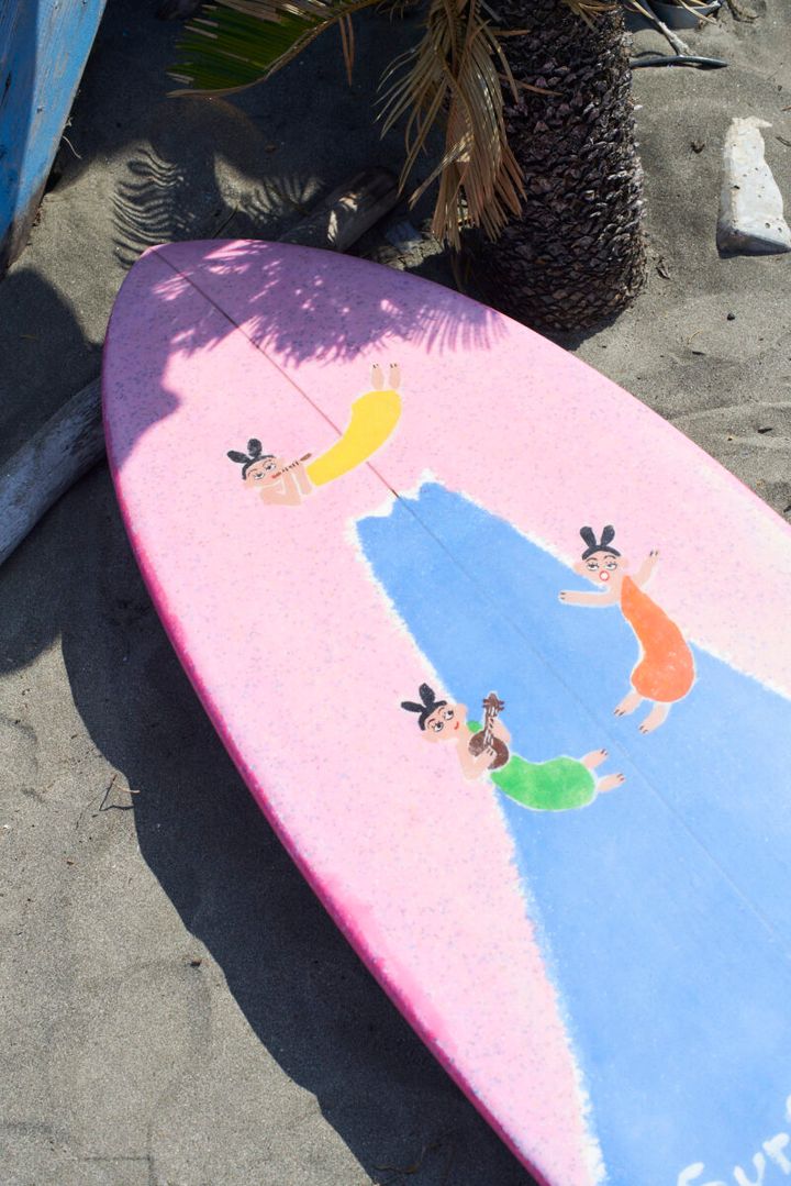 海辺の暮らしに惹かれて葉山町に住み始めた山根さん。「このサーフボードは、EBISU SURF(エビス サーフ)というブランドで、種子島在住のアーティスト、松田大児さんがペイントしてくれました。ここ一色海岸からは富士山がきれいに見えます。富士山の周りで天女が舞う絵が可愛くて、宝物です」(山根さん)