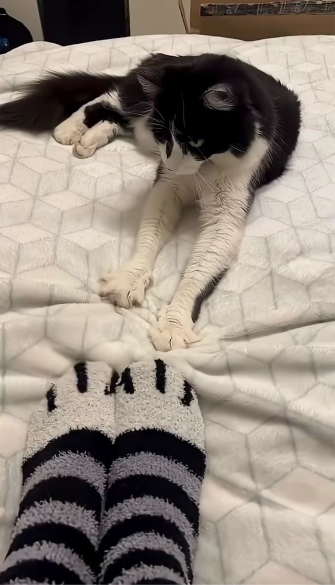ベッドの上で“コネコネ”とおててを動かしているネコ。 その動きに合わせて、飼い主さんもネコ柄の靴下を履いて一緒にコネコネしてみました!