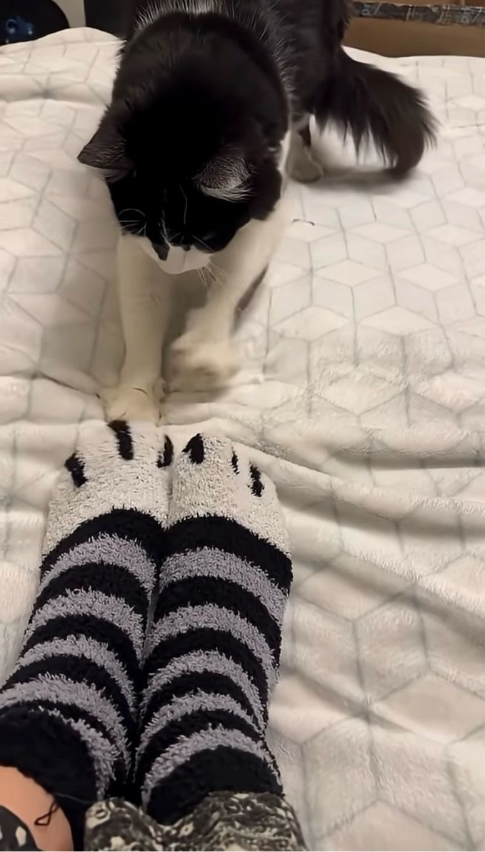 3. 一緒にコネコネ!ネコ柄の靴下を履いて飼い主さんもネコのマネをしてみた!【海外・動画】
