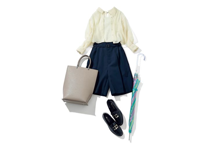 ショートパンツ¥26,400/ドレスレイブ(ジオン商事) 2WAYシアーシャツアンサンブル¥19,800/アプワイザー・リッシェ ローファー¥18,150/ダイアナ(ダイアナ 銀座本店) トートバッグ¥13,000/PLST 傘/編集部私物