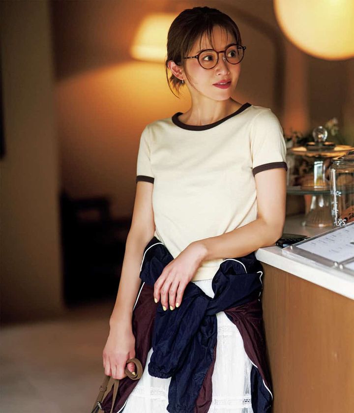 メガネ¥26,180(カリン/WTSROOM)Tシャツ¥6,930(シールームリン)腰に巻いたジャケット¥22,000(アルページュストーリー)スカート¥19,800(メゾンスペシャル/メゾンスペシャル 青山店) バッグ¥47,300(ヴァジック/ヴァジックジャパン)シューズ¥14,960(ニューバランス/ニューバランスジャパンお客様相談室)ピアス¥79,200※片耳価格(プライマル)