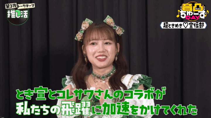 ひよりさんは、「最上級にかわいいの!」を作詞・作曲した覆面女子シンガーソングライター・コレサワさんが大好きだそう。「なんて素敵な歌詞なの♡世界観なの♡」とコレサワさんの魅力に惹かれてファンになったというひよりさん。ラジオ番組にゲスト出演してもらった際に直接「とき宣の曲を書いてください」とお願いして実現に至り、「とき宣とコレサワさんのコラボが、私たちの飛躍に加速をかけてくれた」と語ります。